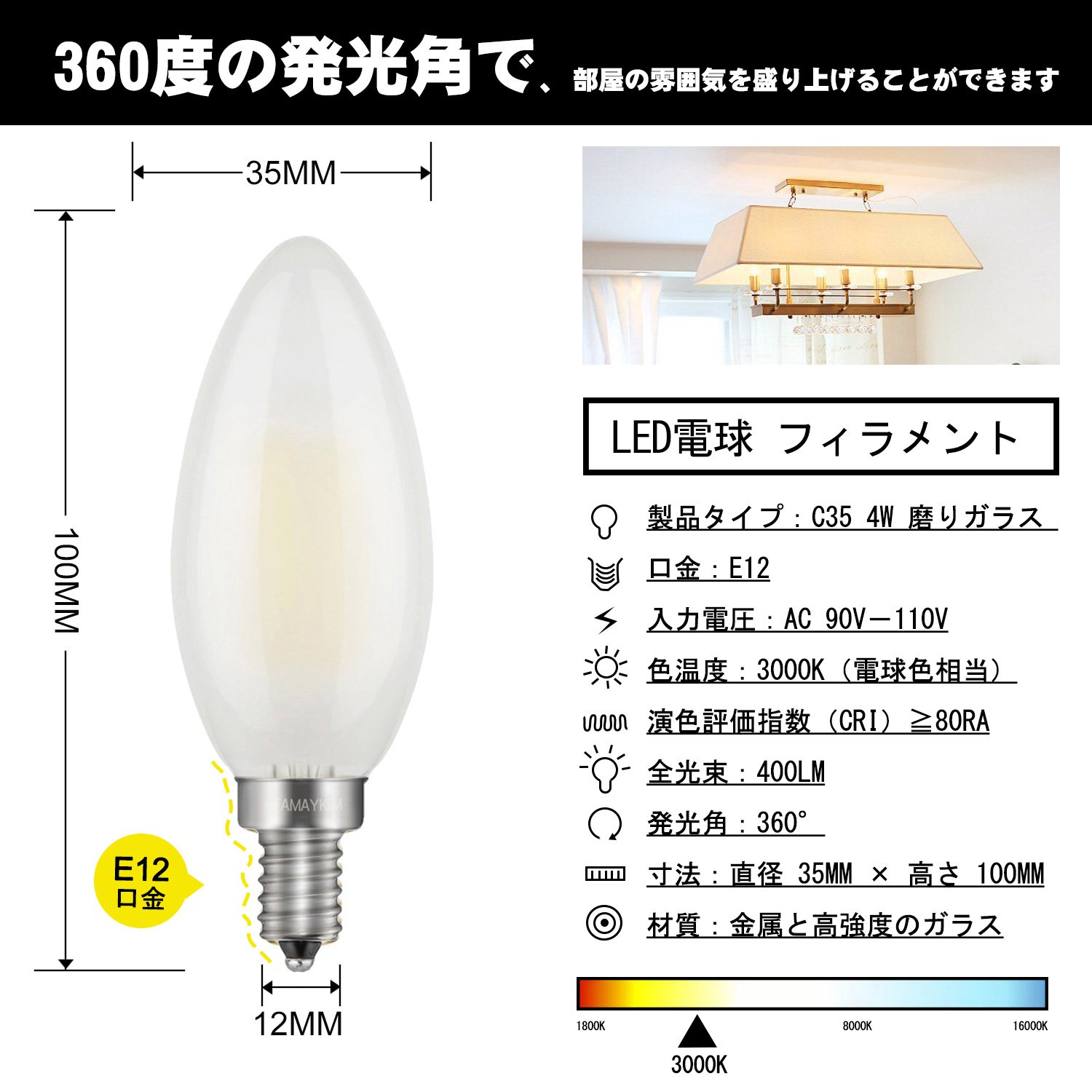 Product type: C35 4W LED filament bulb E12 base 3000K (light bulb color) Non-compatible with lightning type dimmer - 3 pieces