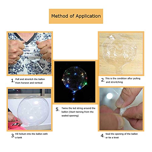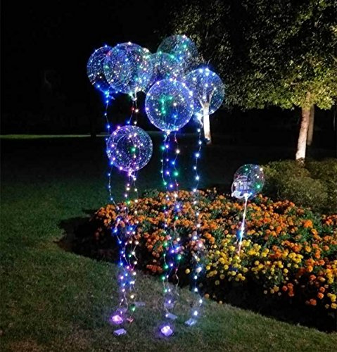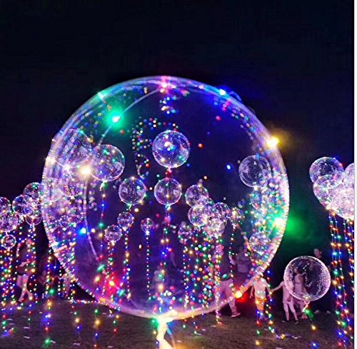 -. Feature : ◆Original Eye Catcher◆ Party decorations balloons with LED Shiner Metal String around it makes the item a total eye catcher at wedding/ birthday parties / ◆Material◆ 18 inches transparent TPU balloon, 9.84 ft Metal String with muiti-colored LED Shiner; The transparent wedding decorations BOBO Balloon will be floating when it's inflated with HELIUM, filling with air can not make it floating, be sure to seal the opeanings of the ballons when it's inflated with enough HELIUM / ◆Shining Mode◆ The wedding led ballons are powered by AA batteries (battery not included). There're 3 models on the power switch: one for keeping lighting and the other one is for flickering and the last model is closing, you may adjust them with your prefer way / ◆Perfect Decorations for Parties◆ Perfect decoration idea ballons for birthday parties, centerpiece, night parties,anniversary, Christmas, holiday parties, gender reveal, wedding celebrations,kids parties and any other celebrations / ◆Package include◆ 5 Crystal Clear Led Party Balloons (not inflated), 5 Colorful Led Light Strings (9.84 ft)