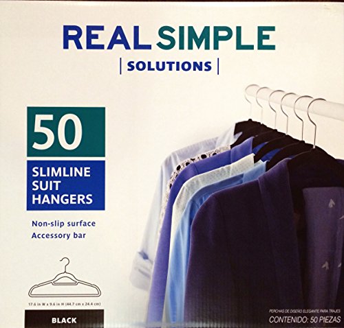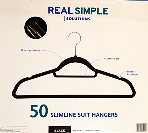 -. Binding : Kitchen -. Brand : Real Simple Solutions -. Color : Black -. EAN : 0650905848704 -. Feature : Flocked, slim-design hangers hold clothing and accessories compactly and securely in place to maximize closet space / Includes an extra bar for organizing belts, scarves, and more so an entire outfit can be organized on one hanger / Measures 17'' W with a 1/4" thick profile / Cannot be used with wet or damp clothing / 50 count -. IsAutographed : 0 -. Label : Real Simple Solutions -. Manufacturer : Real Simple Solutions -. PackageQuantity : 50 -. ProductGroup : Home -. ProductTypeName : HOME -. Publisher : Real Simple Solutions -. Studio : Real Simple Solutions -. Title : Real Simple Solutions Slimline 50-Count Flocked Suit Hangers -. UPC : 650905848704