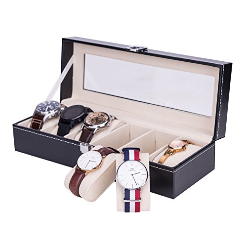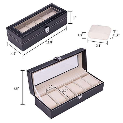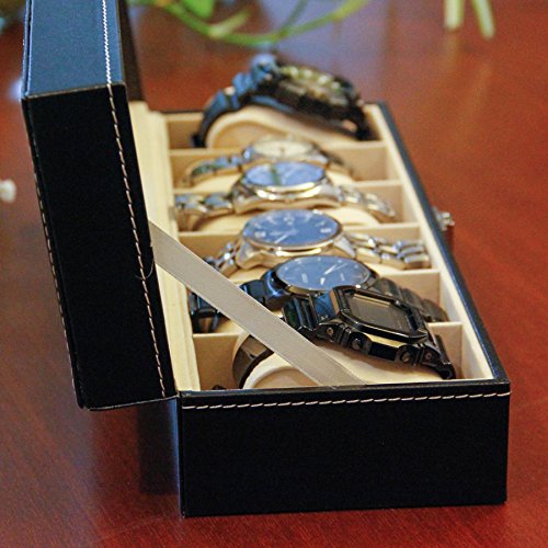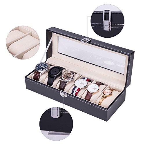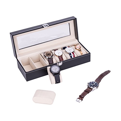 CO-Z Valet Watch Jewelry Box with Lock 6 Slots, Black Leather Watch Display Case for Men (Deluxe 6 Slots)