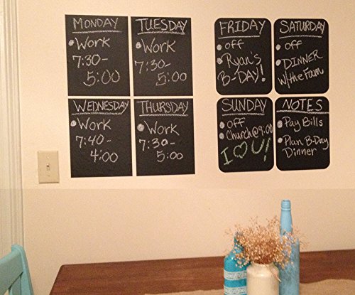 - Feature : ♦♦♦WHAT IS IT: This is a package of (4) 21.6 cm x 28 cm (8.5" x 11") SQUARE Corner Chalkboard Sheets with 1 Chalk Marker included. Chalkboard Wall Decal that you can put where ever you may need...always easy to remove. Great Chalkboard Signs for putting a grocery list on the fridge, leaving the kids a note on their door, keeping notes in your work-space and hundreds of other uses! NOT like cheap chalkboard paper or chalkboard contact rolls. Perfect for menu chalkboard. / ♦♦♦INSTALLATION: Easy step by step PDF instructions will be attached to an email and arrive after your Amazon purchase to your inbox. This chalkboard wall decal can be placed anywhere there is a smooth surface. It's easy to install, just peel and stick. Installation instructions are in the product description below too. / ♦♦♦WHY US: There are many others selling something similar, poor quality, and usually from China. That is not what you will get with our product! We are family owned and take pride in what we sell. Also all of our products are made right here in the USA! So you know you will get a high quality product...that you will be proud to display in your home, office or even a daycare. / ♦♦♦SAFE: You will not have to worry about this decal falling off the wall and possibly hurting someone like you would if you had a heavy Chalkboard. This decal is super DURABLE 7.9 mil thickness that you will not have to worry about tearing. Also water resistant and is safe to put on your wall. Perfect and safe to use as restaurant chalkboard too. A damp rag will easily wipe off the old menu when used as a menu chalkboard. / ♦♦♦CUSTOMER SERVICE: We stand behind our products 100% including service after the sale. If you are not satisfied with your purchase, we have a 100% no questions, no hassle, money back guarantee.