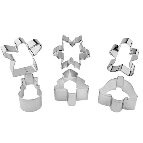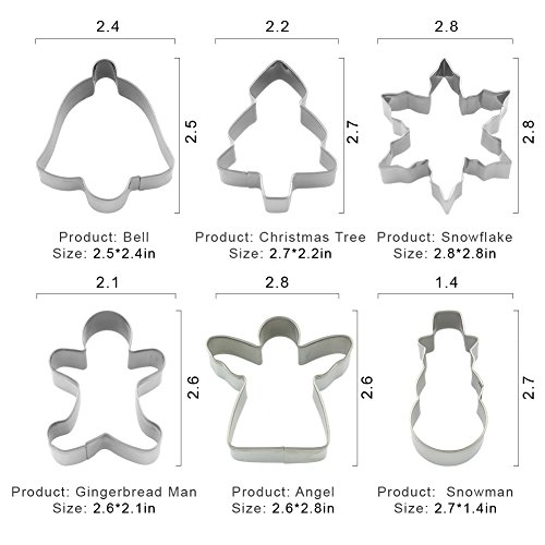 - Winter/Christmas cookie cutter set - 6 piece - Bell: 2.5" x 2.4" Christmas Tree: 2.7" x 2.2" Snowflake: 2.8" x 2.8" Gingerbread Man: 2.6" x 2.1" Angel: 2.6" x 2.8" Snowman:2.7" x 1.4