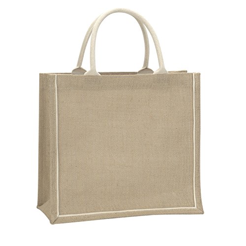Eco-friendly Jute Tote Bag With 13 1/2" Cotton Canvas Rope Straps And Piping, Natural Jute Color