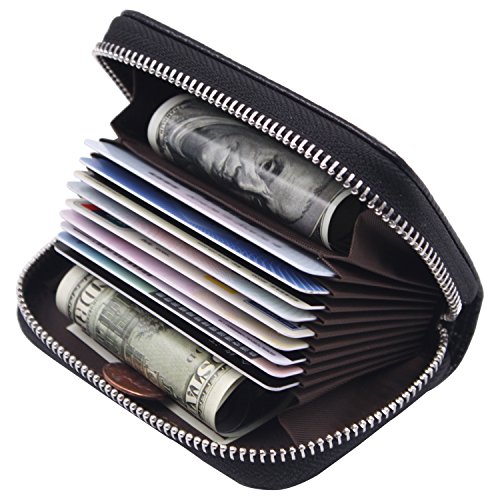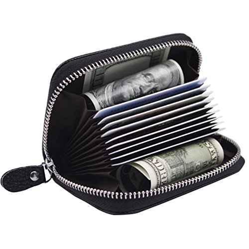 -. Feature : High quality genuine leather with fabric lining and solid hardware. / Credit card holder structure:9 credit card slots,2 cash slots . Each can fit 2 or more cards, Big currency pocket. Convenient feature for those who travel. / RFID Blocking material using both sides of the wallet. / Comfortably holds 9-18 credit cards, some cashes and coins. / Size:4.5"x3.1"x1.1"inches,Weight:0.17 lb. Very small suit your front pocket.