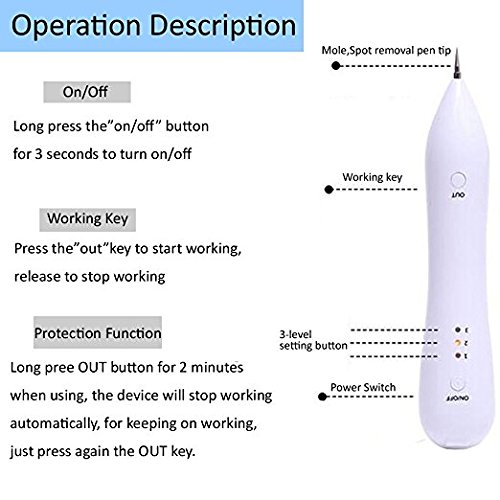 -. Feature : Removal spot without huring the normal skin and without blooding, easy carry and easy operation / Using high-tech, electric ion carbonation functions and instantly sweep freckles, age spot,flat moles,etc,can be achieved quickly without bleeding, safe and side effects of medical cosmetic results / It has 3 kinds of intensity for different treatment. Lower level is used on spot and freckle. Strong level is used on mole and skin tags. / It use new generation of plasma micro district discharge technology with low temperature and high frequency / Kindly Reminder: MyM is our registered trademark, registered number:4587514. Copyright Reserved