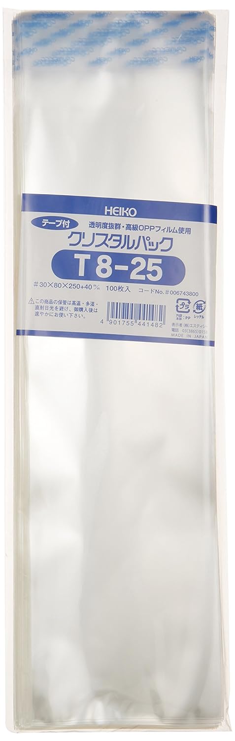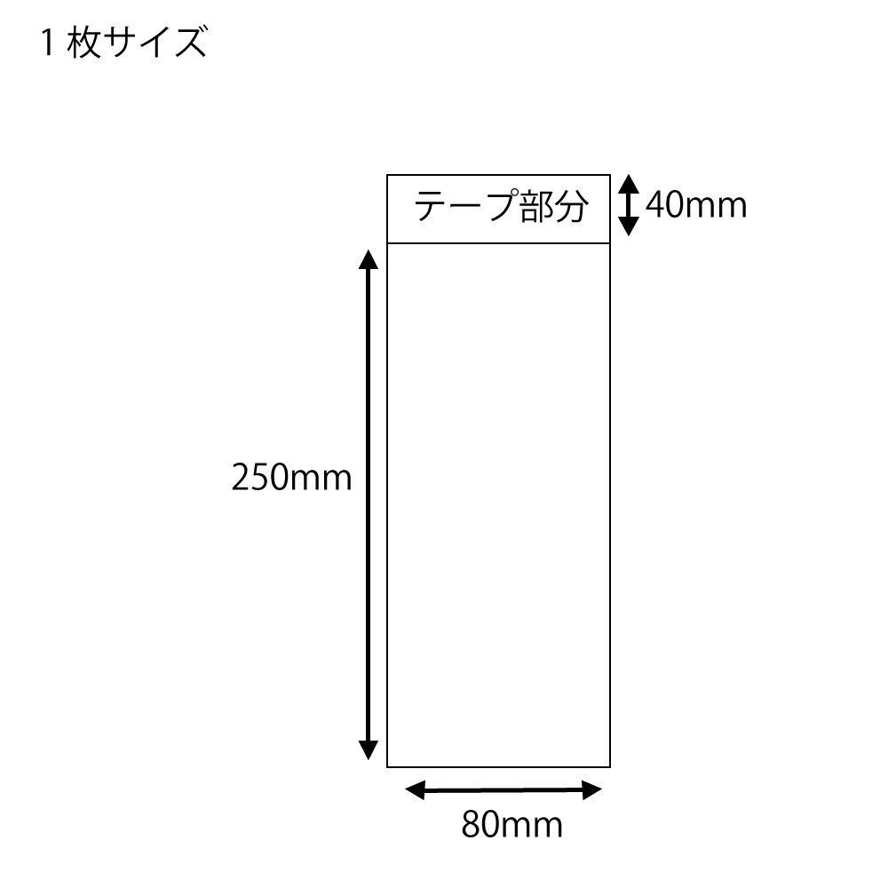 1枚サイズ:巾80×高250×テープ部分40mm 商品特徴:封のできるテープ付き。帯電防止加工。 内容量:100枚入 素材:オリエンテッドポリプロピレン(OPP)