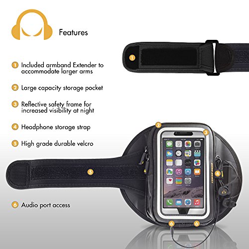 - Feature : Multi-Position Strap fits arms with circumference of 8 to 20 inches * Arms of 16 to 20 inches requires use of included Armband Strap Extender. This exercise armband is the perfect size to carry your necessities without getting in the way. / Made of high quality ultra-soft flexible neoprene molds to your arm for luxurious comfort. Comfort Piping» adds an additional layer of protection eliminating skin irritation from unpadded edges that you see on less expensive armbands. / Headphone Management feature that keeps your ear buds neatly organized as you rock out to your favorite tunes and allows you to easily stow them away after your workout. / Reflective Safety Stripe increases visibility during low light and nighttime activities. Be Seen and Be Safe! / Customer satisfaction is our top priority; please do not hesitate to contact us if your Armband does not meet your expectations