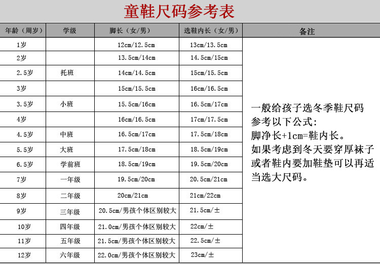 尺码选择温馨提示:童款每个厂家的尺码规格不同,建议按孩子的脚净长和鞋内长来选尺码。所标尺寸为我们随机抽样测量所得,仅供您参考;决定购买与否  以及尺码请您自行定夺,谢谢配合!