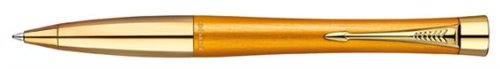 Parker Urban 125th Anniversary Special Edition Premium Mandarin Yellow GT Ballpoint pen has a shiny gold grip area and gold trims. The barrel is anodized aluminum.