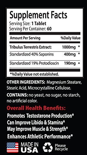 -. Feature : TRIBULUS TERRESTRIS EXTRACT: Tribulus terrestris is a flowering plant native to the warm temperate and tropical regions of Europe, southern Asia, Africa and Australia. It's used in herbal nutritional supplements that can be beneficial for producing large gains in strength and lean muscle mass, also Tribulus can be helpful for increasing testosterone in men. / TRIBULUS TESTOSTERONE BOOSTER FOR MEN: Tribulus terrestris can increases testosterone levels, which helps to increase muscle mass. According to the Physicians studies reveal an increase in testosterone levels when tribulus terrestris is taken. The rise in testosterone level reduces the time for the muscles to recover, increase stamina and boost energy. / TRIBULUS FOR MEN AND WOMEN: Studies have shown that tribulus terrestris can be beneficial for boosting your circulatory system which can be helpful for your body pump important oxygen and nutrients to your muscles. / TRIBULUS STRENGTH TESTOSTERONE BOOSTER: Tribulus terrestris also can be beneficial for maintaining a healthy weight. This use is especially common among bodybuilders and other athletes with high rates of calorie expenditure. / OUR GUARANTEE: PREMIUM QUALITY SUPPLEMENT PROUDLY MANUFACTURED IN THE USA! We use only the very best ingredients, all of which are manufactured in state-of-the-art facilities, with strict adherence to good manufacturing practices (GMP).