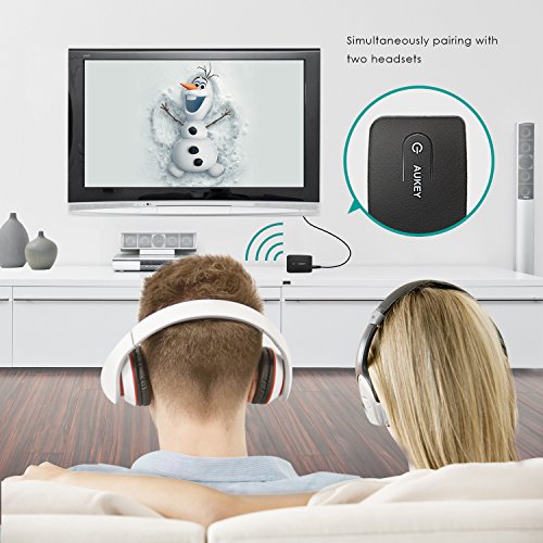 - Feature : Instant wireless audio for your 3.5 mm music device (TV audio, CD player, MP3, DVD, e-Reader, and more) / aptX enables pure, professional, uncompromised music and sound quality / Bluetooth 4.0, pair easily with Bluetooth headphone, headset, speaker and other Bluetooth receivers / Simultaneously Pairing with Two Headsets, you can hear sound from both headsets. / Package Content: Aukey Bluetooth Transmitter, USB charging cable, User Manual, 18 Month Worry-free warranty