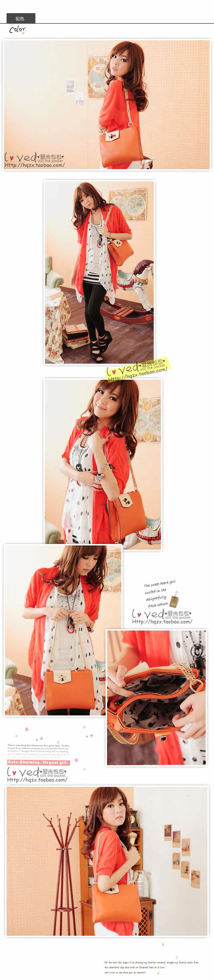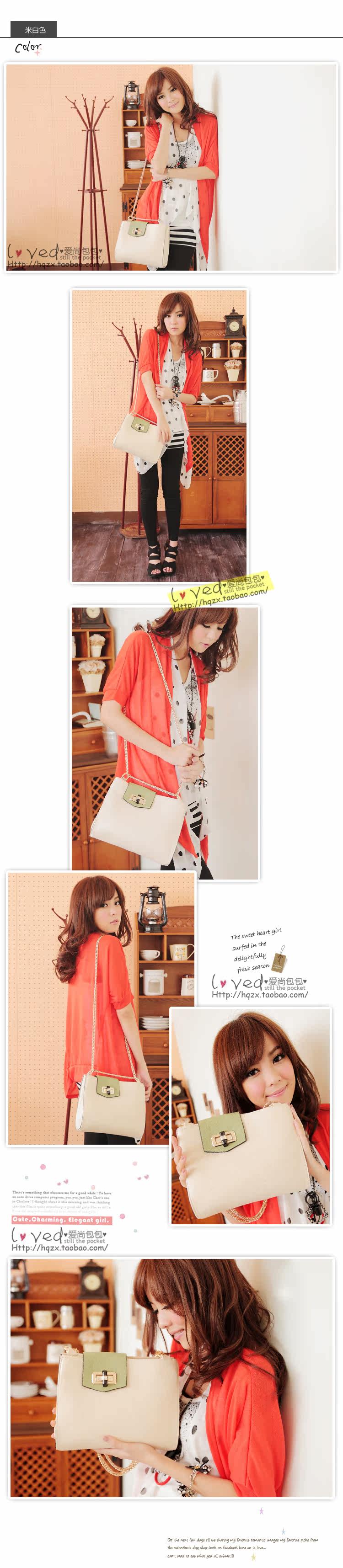 Absolutely Transformers style, two-color stitching makes this bag has a strong and practical joker, black single-button design side of the rotation, there are side pockets design, space can accommodate two middle is also very strong, metal chains also great range of children Oh, this summer with a small bag, great range of children is very special wood there ~ ~