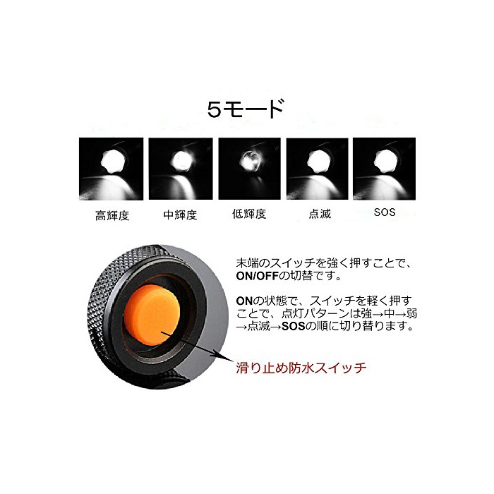 【5개 점등 모드】고휘도/중 휘도/저 휘도/점멸/SOS SOS신호 패턴 기능이 있고, 만일의 경우에 위력을 발휘에서 옵니다.