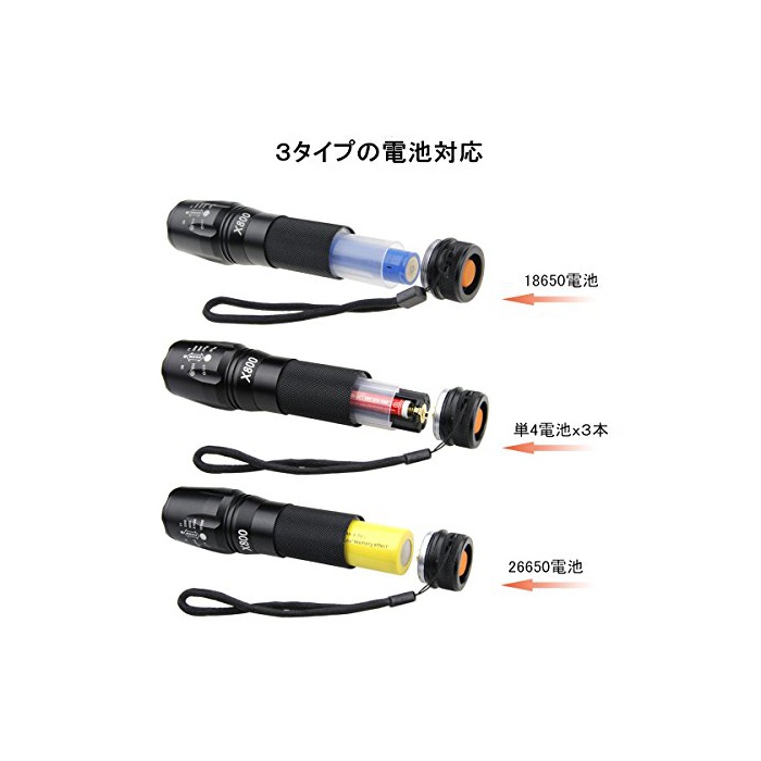 【대응 배터리】18650전지x1,또는 26650전지x1,또는 단4전지x3개.26650전지,충전기와 단4전지용의 소켓이 부속합니다.