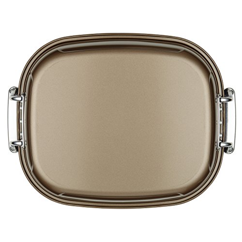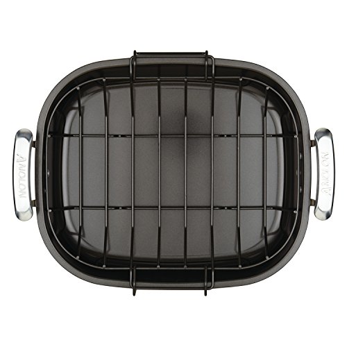 Savor the superb roasting performance of the Anolon Nonstick Bakeware 16-Inch x 13-1/2-Inch Roaster with Hanging U-Rack with easy cleanup and elegant design, and make the most of gourmet-quality roast entrees. Anolon Bakeware combines top-grade ovenware construction and a stylish two-tone palette for premium roasting enhanced by a distinctive look. Warp-resistant heavy-duty steel provides the durability home cooks demand, whether the recipe is the traditional centerpiece of a holiday menu or simply a slow-roasted weekend dinner. The roasting pan rims are rolled for even more durability, and the cast aluminum side handles are generously sized for plenty of grasp even with bulky oven mitts. Elegant pewter-tone nonstick inside promotes even roasting and browning, and with the sumptuous bronze-tone nonstick exterior, provides beautiful food release. This nonstick roaster from Anolon features professional-quality design, and the sturdy nonstick-coated removable wire rack features drop-down handles, making it easy to move roasts in and out of the pan. Used without the rack, the pan is perfect for slow-roasting root vegetables or even baking a larger casserole, as the nonstick pan interior helps release even sticky foods with ease. While handwashing is recommended, the bakeware is conveniently dishwasher safe. Oven safe to 450 DegreeF, the roasting pan comes with the Anolon Lifetime Warranty. Enhance the quality of your oven's roasting capabilities whether it's the seasonal turkey, a weekend rib roast, or a weeknight chicken dinner, with the Anolon Nonstick Bakeware 16-Inch x 13-1/2-Inch Roaster with Hanging U-Rack.Feature