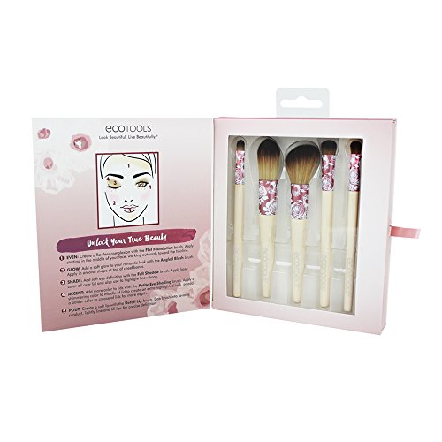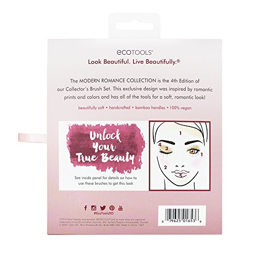 -. Feature : The EcoTools Modern Romance Collection is the 4th Edition of their Collector's Brush Set. This exclusive design was inspired by romantic P.R.Ints and colors and has all of the tools for a soft, romantic look. Five brushes for five, flawless effects. / EVEN: Start by creating a flawless complexion with the Flat Foundation brush. GLOW: Next add a soft glow to your romantic look with the Angled Blush brush. SHADE: Now add soft eye definition or highlight the brown bone with the Full Shadow brush. / Petite Eye Shading Brush: Add more color to the lids with the Petite Eye Shading Brush. Detail Lip Brush: Finally, create a soft lip with the Detail Lip Brush. Dab brush into favorite product, lightly line and fill lips for precise definition. / In 2017, we're celebrating EcoTools' tenth anniversary by introducing a fresh new look, brushes that feel even better in your hands and packaging with detailed tutorials that will make it easier than ever for you to create a beautiful look from hair to toe / At EcoTools, we want you to embrace your own individual meaning of beauty & share it with the world, whether it's makeup tutorials, an inspirational story, or giving back to the community, when you feel truly beautiful, you'll make the world feel beautiful
