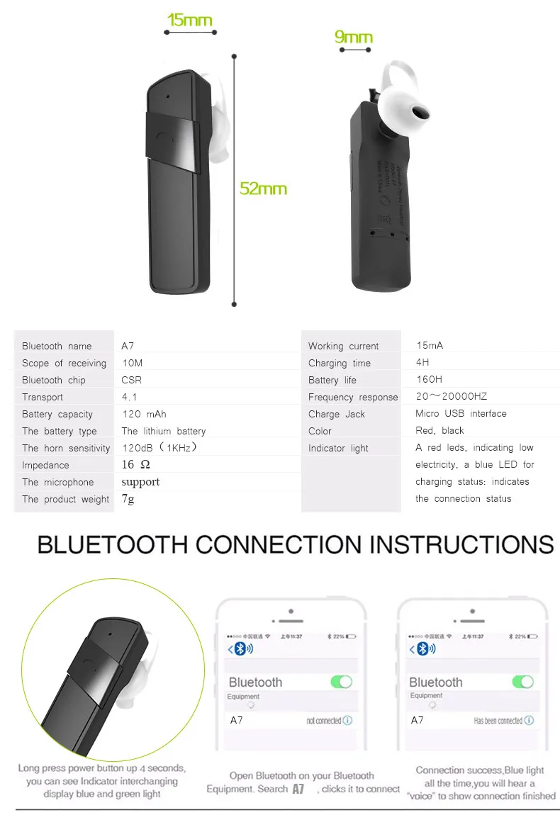 A7 Portable Business Bluetooth Headphone Stereo 4.1 Ear Hook Headset Handsfree MINI Music Earphone Car Driving with MIC Earbunds