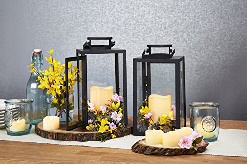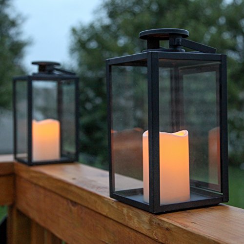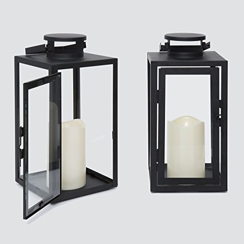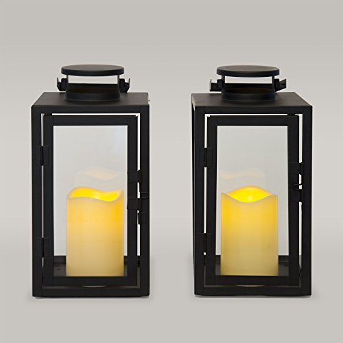 REALISTIC ✓ - 2 Black Metal and Glass Lantern with a flickering warm white LED Resin Candle in each lantern. A great addition to indoor and outdoor decor, each of these metal framed lanterns include a flameless candle that illuminates against each glass panel with a warm flickering glow like a real candle.