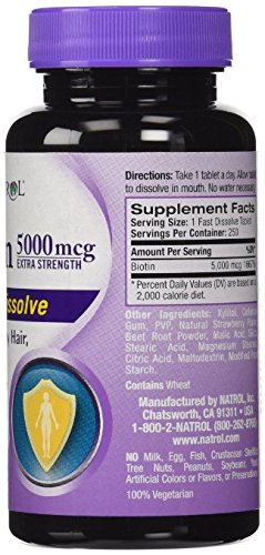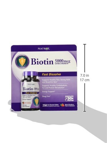 Natrol Biotin supports healthy luxurious hair, beautiful skin, and strong nails, in addition to energy production. A water-soluble B-complex vitamin, biotin is necessary for cell growth and the production and metabolism of fat into amino acids. Natrol Biotin provides 5,000 mcg to help ensure the daily need for this essential nutrient is met. 100% Drug Free! 5000mcg dose per tablet-- all natural Strawberry Flavor in a Fast Dissolve tablet! Natrol Fast Dissolve tablets dissolve up to 30 times faster than other pills! Natrol makes this product in the U.S.A.!Feature