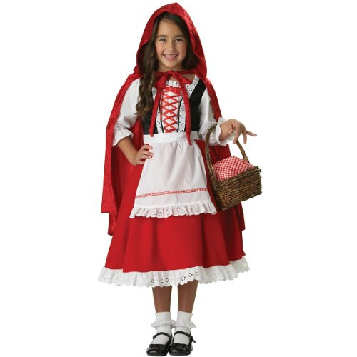 Once upon a time there was a delightful little girl on her way to grandmothers house. Gorgeous fully finished garment the "Little Red Riding Hood" costume includes dress with white top Black lace-up attached vest red skirt accented with ruffled white lace and attached apron petticoat and a red panne cape with hood. Plus this costume comes in its own deluxe garment bag to help keep this an heirloom for generations to come. This charming "Little Red Riding Hood" costume is perfect for Halloween Birthdays or just creating picture perfect memories you and your family are sure to cherish. Features:. Size: 8. Includes: dress with apron petticoat and cape. Picnic basket sold separately may differ slightly from shown. Use your own white socks and Black shoes (not included) to complete the look as shown. Packaged in an individual garment bag with hanger. Looking for a family theme costume? Pair with "Big Bad Wolf" and "Red Riding Hood Adult Elite Collection" costumes for Mom and Dad. Material: Dress: 95% Polyester/5% Cotton- Cape: 100% Polyester.Feature