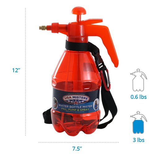 The 1.2 Liter, 12" height x 8" diameter personal mister bottle bottle has an adjustable brass nozzle that allows you to switch from a fine mist to a stream that shoots over ten feet. Bottles come in five bright colors, so everyone in the family can have one that matches their style. Each bottle also comes with its own carrying strap, for easy portability. These handy misters are perfect for outdoor summer festivals or concerts, amusement parks, zoos, sports events, or even your own backyard. They have lots of other uses, too - use them to mist your plants, dampen clothes for ironing, or set your frisky feline straight!