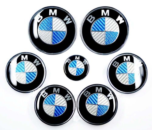 BMW Blue Silver Carbon Fiber Emblem Badge Logo for Hood Front & Trunk Rear 82mm 3.23 inch, 2 pins at the back, Steering Wheel Sticker 45mm 1.77 inch & Wheel Center Hub Caps 4pcs, totally 7pcs