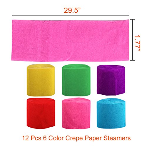 - RAINBOW STREAMERS - Crepe paper streamers are in 6 vibrant colors: red, yellow, blue, green, pink and purple. Each roll measures 1.77- inch width, 29.5 feet length