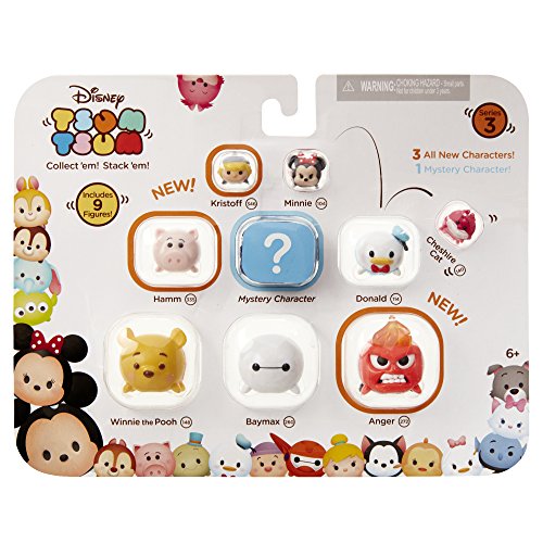 -. Binding : Toy -. Brand : Tsum Tsum -. EAN : 0039897016788 -. Feature : Now you can collect, stack and display your favorite Disney characters in a totally new, whimsical scale / Each 9-Pack includes 3 Small, 3 Medium and 3 Large sized Tsum Tsum figures / One mystery hidden figure in each pack / Style #1 includes: Pooh-L/Anger-L/Baymax-L/Hamm-M/Mystery-M/Donald-M/Cheshire-S/Minnie-S/Kristoff-S / For ages 6 and up -. Label : Jakks -. Manufacturer : Jakks -. Model : 01678 -. MPN : 01678 -. PackageQuantity : 1 -. PartNumber : 01678 -. ProductGroup : Toy -. ProductTypeName : TOYS_AND_GAMES -. Publisher : Jakks -. Studio : Jakks -. Title : Disney Tsum Tsum 9 PacK Figures Series 3 Style #1 -. UPC : 039897016788 -. Warranty : No Warranty