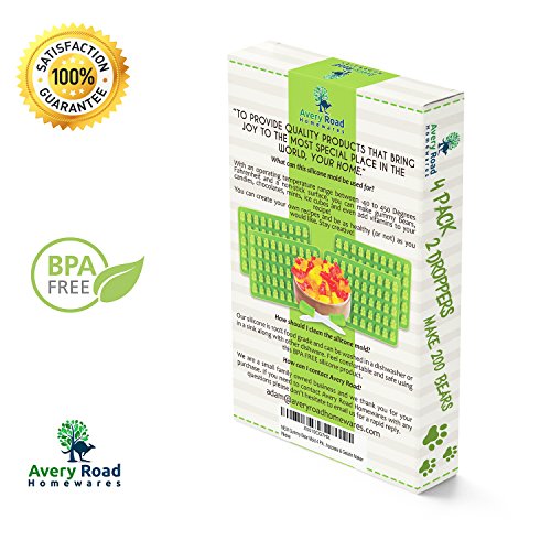 Customer Service is our #1 Priority. Avery Road Homewares is a small family owned business that strives to deliver a great product with exceptional customer service. Thank you for your purchase Gummy Bears Mold by Avery Road Homewares Everybody Loves Gummy Bears! Enjoy Yummy tasty gummy treats that contain the ingredients that you choose! Make 20, 50, 100, up to 200! At a time with this 4 pack and two 5 ML droppers. Serve to your friends and family and feel proud! You Can Make Gummy Bears! The Gummy Bear molds are BPA-Free and FDA Approved. These snacks are fun but remember... Safety First! Enjoy Avery Road Homewares 100% SATISFACTION MONEY BACK GUARANTEE. We are so confident you will love our product that with no questions asked we will replace or refund you if you are not satisfied. Click 'ADD to CART' to make a Risk-Free Purchase, and start making Gummy Bears! 0