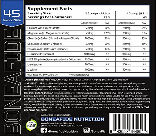 Boneafide BCAA+HICA is loaded with 10 Grams of Leucine and 1500 Milligrams of HICA. There is no other BCAA like this on the market, Not only do we list out every ingredient without any hidden blends, we are cGMP certified so you know that quality is our top priority. BCAA supplementation can promote muscle protein synthesis and increase muscle growth over time. HICA, also known as Leucic acid, is a metabolite of Leucine that has anabolic properties. Combining Leucine and HICA peri-workout allows for high intensity workouts prolonging fatigue ensuring sustained and high powered workouts.Feature