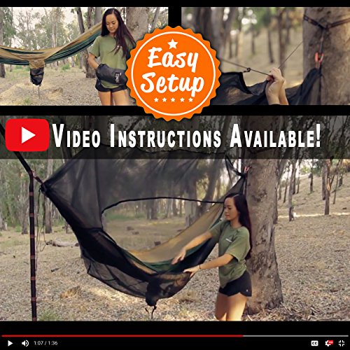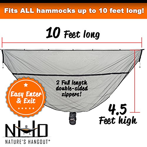 UNIQUE, EASY ACCESS: No gymnastics necessary to enter. Dependable, double zipper opening extends entire length of the net for easy access. FITS MOST HAMMOCKS: Dimensions - 10' x 4.5' (unpacked) 5.75" Diameter 7.5" Tall (packed). Big enough to sleep diagonally.