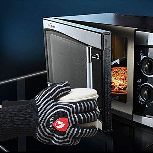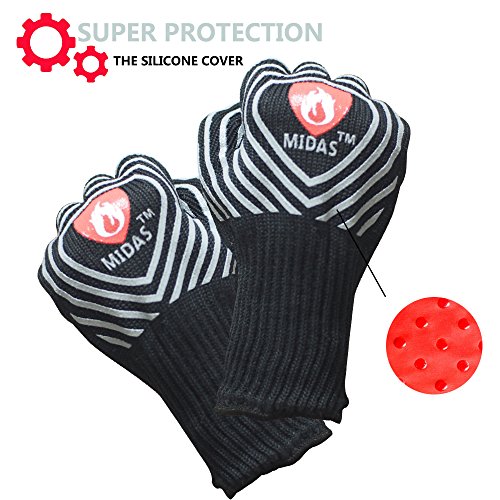 - ★HIGH QUALITY AND SAFETY: Midas heat resistant mitts are great for use in variety of ways. Use them as oven gloves while baking, as BBQ gloves while grilling outdoors, baking, or as general high heat resistant gloves for moving wood around in a fireplace, or changing a hot light bulb and many more. Every Midas Guard fire resistant gloves passed the EN407 Certification.