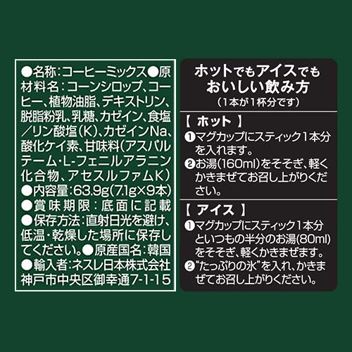原材料:コーンシロップ、コーヒー、植物油脂、デキストリン、脱脂粉乳、乳糖、カゼイン、食塩/リン酸塩(K)、カゼインNa、酸化ケイ素、甘味料(アスパルテーム・L-フェニルアラニン化合物、アセスルファムK)