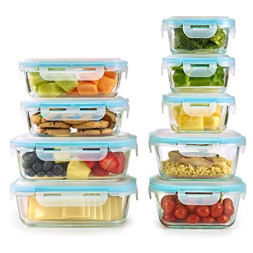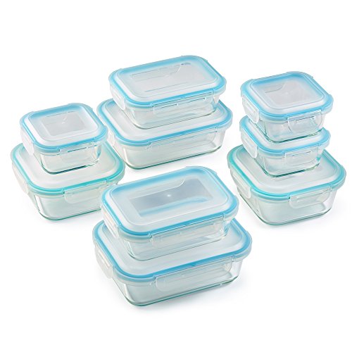18 piece set includes 9 premium glass containers of varying sizes and 9 matching domed locking lids. Made from the best quality borosilicate glass to be thermal shock resistant and 100% FDA approved and food safe.