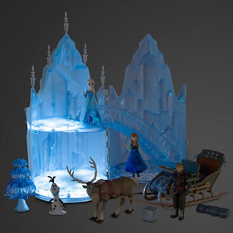 Ice-''burg'' Transport playtime fantasies to the frigid North where Elsa's Musical Ice Castle towers above the toy competition. Our Frozen fortress lights-up and plays Let it Go as 5 play figures frolic in the fold-out setting with sleigh.