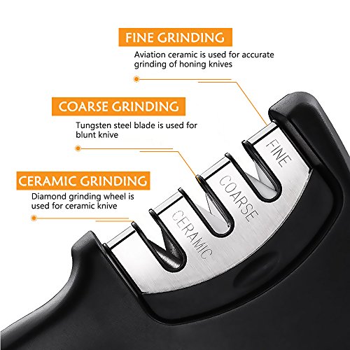 【3-Stage Sharpener System】Made with high quality 304 stainless steel. Fine stage is used for accurate grinding of honing knives; Coarse stage is used for blunt knives; Ceramic stage is used for ceramic knives. For protecting your knife blade,same direction only and repeat about 5 times.