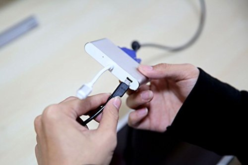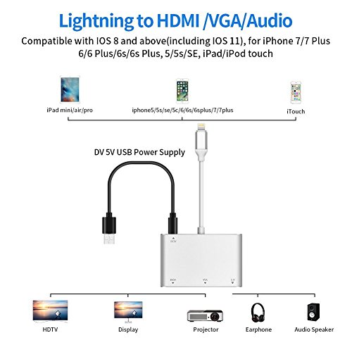 This 3 in 1 Lightning to HDMI VGA Audio Adapter supports mirroring of what is displayed on your iPhone device screen?---including movies,TV shows,music,video,photo,and more from browser--to your HDMI or VGA display,projector,or other compatible display in up to 1080P HD. Features: 1.Support both HDMI and VGA output Resolution up to 1920 x 1080 2.Wide compatibility : iPhone 5/5c/5s/6/6 Plus/6S/ 6S Plus/7/7 Plus,ipad pro/air/mini and ipod. 3.Plug and play ,easy to use 4.Compatible with All of the OVER IOS 8.0 Version iPhone iPad. Friendly Note: 1.When connect the HDMI output to your HDTV ,you will hear the sound directly .While connect the VGA output to your HDTV , you need to connect an additional Speaker into the Audio output for hearing the sound. The audio output can be used alone without a video output 2. It is necessary to connect the adapter to the charger power , otherwise the adapter will not work properly. 3.Not Compatible with Apps which have "HDCP" video copyrights protection like Netflix, Amazon video, HBO go, HULU and Honda motor and other App which need to be paid fee. Because these App are encrypted and are not authorized for third-party software sharing. Package Contents: 1*Main Unit 1* User manual Our Customer Satisfaction Promise.? ONE-YEAR SOLID WARRANTY: Once you buy our product, you can get our 1 year warranty. We offer 12-month warranty and friendly customer service.? ?For any defective product or product you aren't satisfied with, you can freely contact us for a refund or a replacement.? 0 |