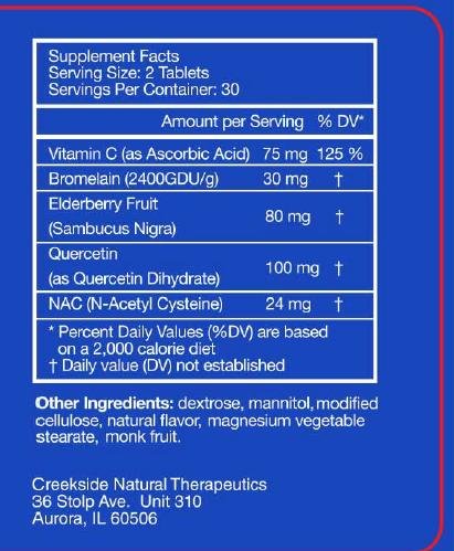 -. Feature : An all natural way to soothe Cold or Allergy symp in children without undesired side effects / Per sested serving (2 tablets): Bromelain 30 mg, Quercetin 100 mg, NAC (N-Acetyl Cysteine) 24 mg, Vitamin C 75 mg / Brought to you by Dr. Natalie: A Board Certified Pediatrician with an emphasis on Integrative Medicine / A 60 ct. Bottle for ages 2 and up in a great-tasting, EZ Melt tablet: Vegan and contains no gluten or dairy