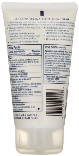ReleaseDate : 2014-02-01 Studio : Beiersdorf, Inc. Publisher : Beiersdorf, Inc. Binding : Health and Beauty Product Description Your skin is much more than your body's protective shield. For over 100 years Eucerin has pioneered skincare innovation and today we are recognized by dermatologists as one of the leading and most recommended brands. Our products are designated to protect, repair, and enhance the health of skin ? Giving the feeling of confidence that comes from radiant, healthy looking skin. This unique formula with Oatmeal, Ceramide-3 and Licochalcone intensively moisturizes and helps relieve dry, irritated skin and itching due to eczema. Clinically proven immediate and long-lasting relief of itchy, dry, irritated skin due to eczema. 0