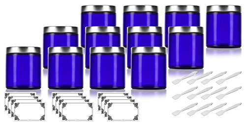 - Includes 12 - 4 oz / 120 ml Cobalt Blue Glass Straight Sided Jars with Metal Foam Lined Lids + Spatulas and Labels