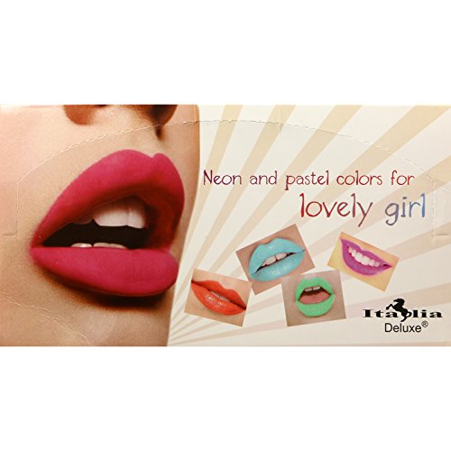 -. Binding : Misc. -. Brand : Italia Deluxe -. EAN : 0782353001902 -. Feature : Set of 12 Neon & Pastel True color lipsticks / Long lasting color / Super high grade materials used in production / Party Favourite Lipsticks / Not tested on Animals; Proud member of PETA -. Label : Italia Deluxe -. Manufacturer : Italia Deluxe -. Model : 190 -. MPN : 190 -. PackageQuantity : 1 -. PartNumber : 190 -. ProductGroup : Beauty -. ProductTypeName : BEAUTY -. Publisher : Italia Deluxe -. Studio : Italia Deluxe -. Title : Italia Deluxe Neon & Pastel Set of 12 Lovely Girl Lipstick #190 -. UPC : 782353001902