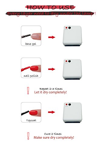 How to use: 1. Clean Nails then trim nail surface as normal manicure process 2. Fully shake up the polish, it can make the polish color be balanced 3. Apply Base coat first, which can make polish lasting longer, cure with UV lamp or LED lamp 4. Apply first layer of color polish directly, cure with UV lamp for 2 minutes or cure with LED lamp for 60 seconds 5. Apply second layer of color polish, cure with UV lamp for 2 minutes or cure with LED lamp for 60 seconds 6. Coat with removable topcoat, which can make color more shining, then cured by UV lamp or LED lamp 7. Remove the tacky surface with cotton soaked with cleanser Remove: 1. Soak off the nails into Gel remover for about 5 minutes 2. Rip down the whole piece of nail enamel gently on each nail 0