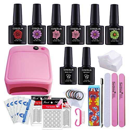 1 x 36W Pink UV Nail Lamp 1xCoscelia Top coat 1xCoscelia primer 5xNail Polish Remover Pads in Foil Packet 3xFrench Nail Tips 1x100pcs Nail Polish Remover Pads 2x Sunshine File Buffer 1 x Round Nail File 1x 4-way nail art buffing block 10 x Nail Strip 1x Steel Pusher 1 x Clean Brush 6x nail polish