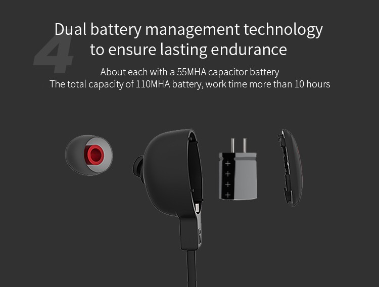 Headset Wireless Bluetooth dengan ukuran mini namun berkualitas tinggi. Dilengkapi dengan Bluetooth 4.1 APTX dan ceramic shell antena wireless menghasilkan trasmisi suara lancar dan bass yang 'nendang'. Dapat menghasilkan suara yang memuaskan walau dalam volume rendah dan dapat meredam suara bising dari luar. Menggunakan baterai dobel dengan proteksi IC membuat baterai tahan lama meski mengalami kelebihan pengisian daya baterai.
