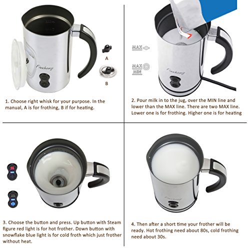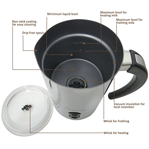Makes hot or cold milk froth for cappuccino or iced drinks.Heats milk for Latte or other hot drinks within a very short time around 150F°. Heating, frothing, stir which is multifunctional.
