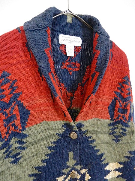 Ladies ブランドJONES NEW YORK カラーカラフル メール便不可 コンディション★★★ 素材ラミー・コットン 表記サイズS スタッフコメント※一部赤色がにじんでいる箇所があります。 実寸サイズ 着丈 69 cm 身幅 47 cm 肩幅 43.5 cm 袖丈 54 cm ※ウエスト・ヒップ以外は平置き採寸