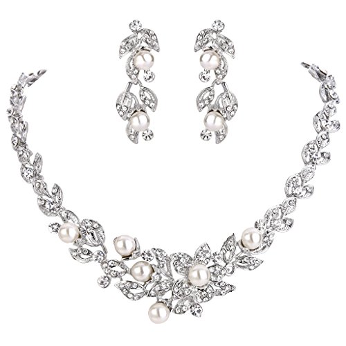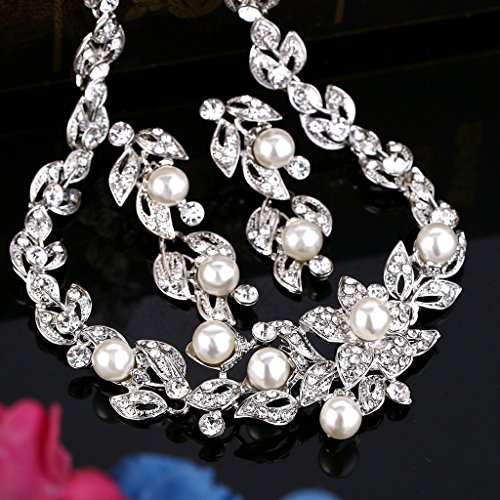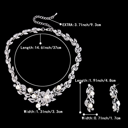 -. Title : BriLove Women's Wedding Bridal Crystal Cream Simulated Pearl Cluster Leaf Vine Hibiscus Flower Collar Necklace Dangle Earrings Set Clear Silver-Tone