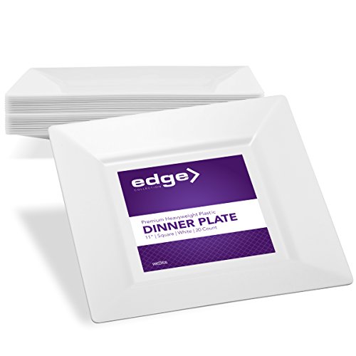 EDGE PLASTIC PARTY DISPOSABLE PLATES | 11 Inch White Hard Square Large Wedding Dinner Plates, 20 Ct | Elegant & Fancy Heavy Duty Hard Party Supplies Plates for Holidays & Occasions