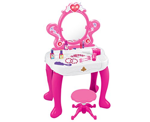 This vanity toy set includes everything a child could imagine in a vanity set. 1 necklace, 2 bracelets, 2 rings, 2 lipsticks, 3 nail polish, 2 stylish hair rubbers, comb, battery operated hair dryer, mirror, small chair and an installed piano.