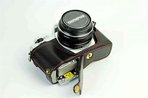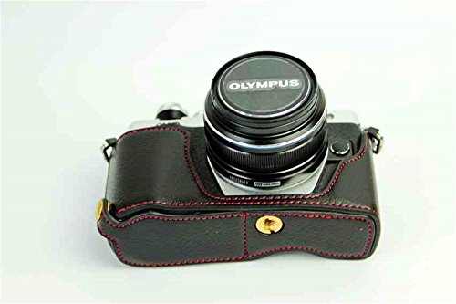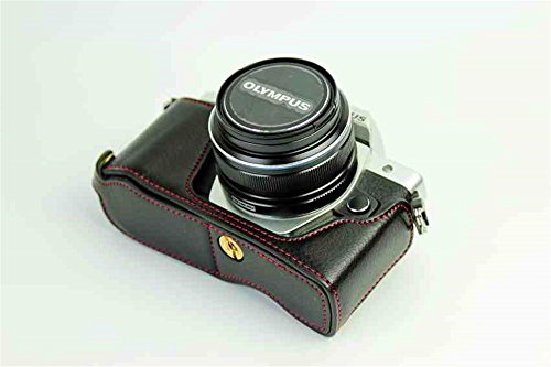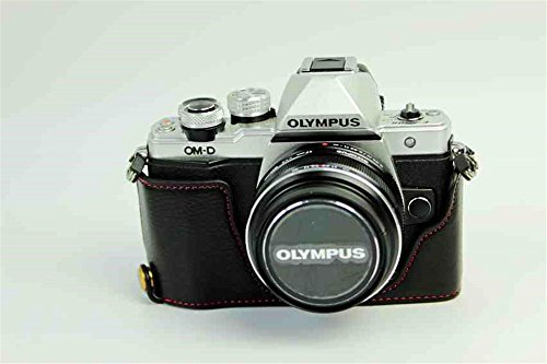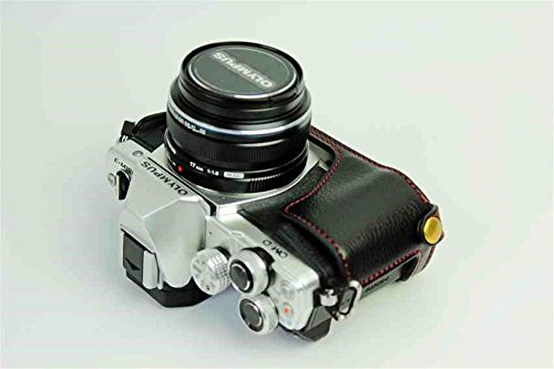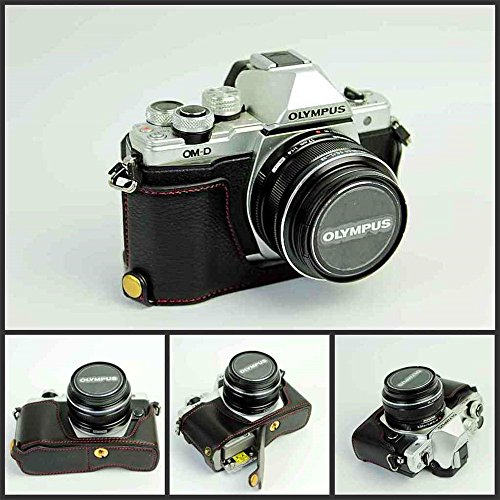 BolinUS Handmade Genuine Real Leather Half Camera Case Bag Cover for Olympus OM-D E-M10 EM10 Mark II Bottom Opening Version + Hand Strap - Black